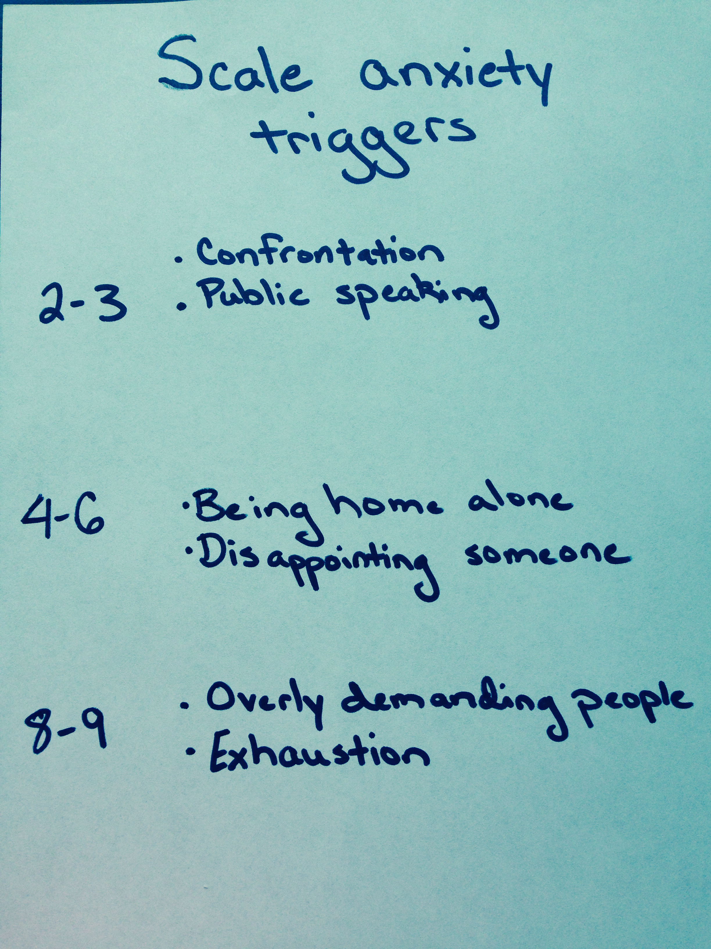 These are examples of triggers I have seen that tend to bring anxiety. This is a small list, your trigger(s) may be different.